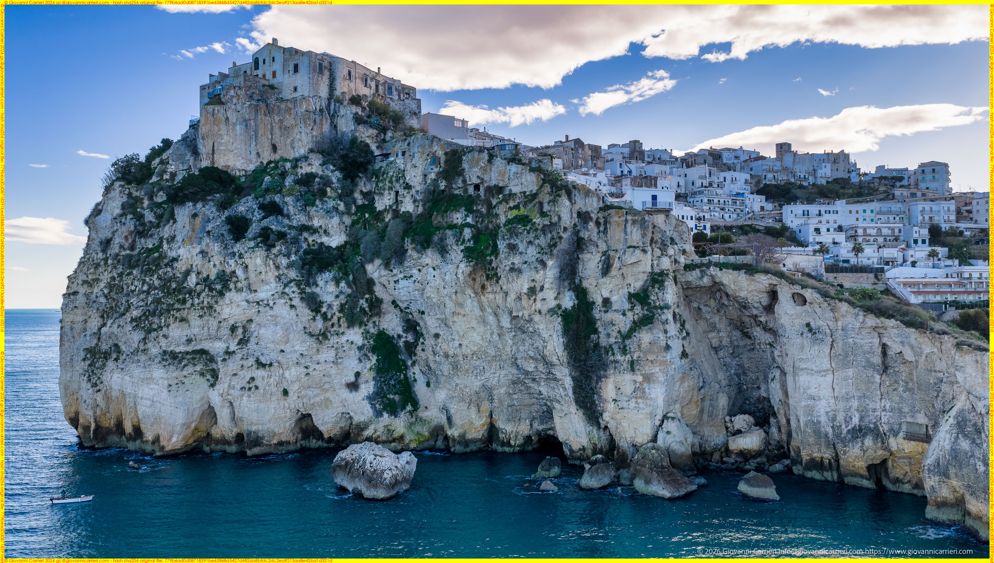 Si attesta che in data 07/01/2026 alle 16:01:57 il/la Sig./Sig.ra Giovanni Carrieri (ragione sociale Giovanni Carrieri) ha registrato l'immagine denominata "The cliff of Peschici featuring the Castle and the urban core overlooking the Adriatic Sea" qui riprodotta. Il titolare dei diritti d'autore ha dichiarato che sia stata pubblicata nel corso dell'anno 2026.