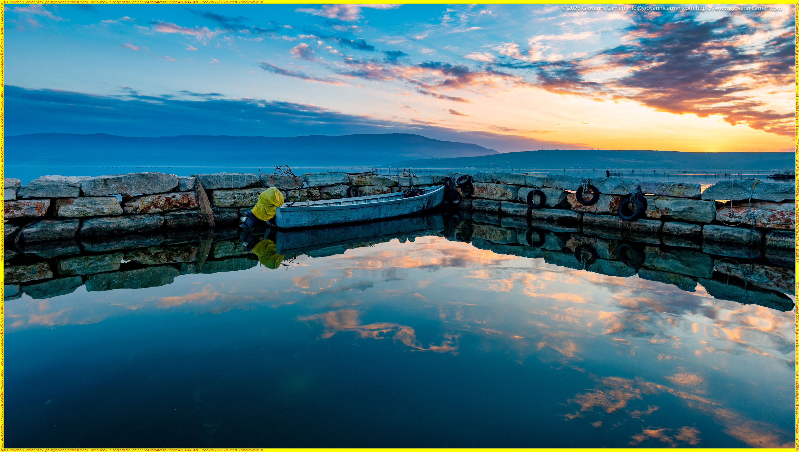 Si attesta che in data 18/01/2026 alle 18:01:00 il/la Sig./Sig.ra Giovanni Carrieri (ragione sociale Giovanni Carrieri) ha registrato l'immagine denominata "Vista del tramonto su un ormeggio artigianale presso il Lago di Varano" qui riprodotta. Il titolare dei diritti d'autore ha dichiarato che sia stata pubblicata nel corso dell'anno 2026.