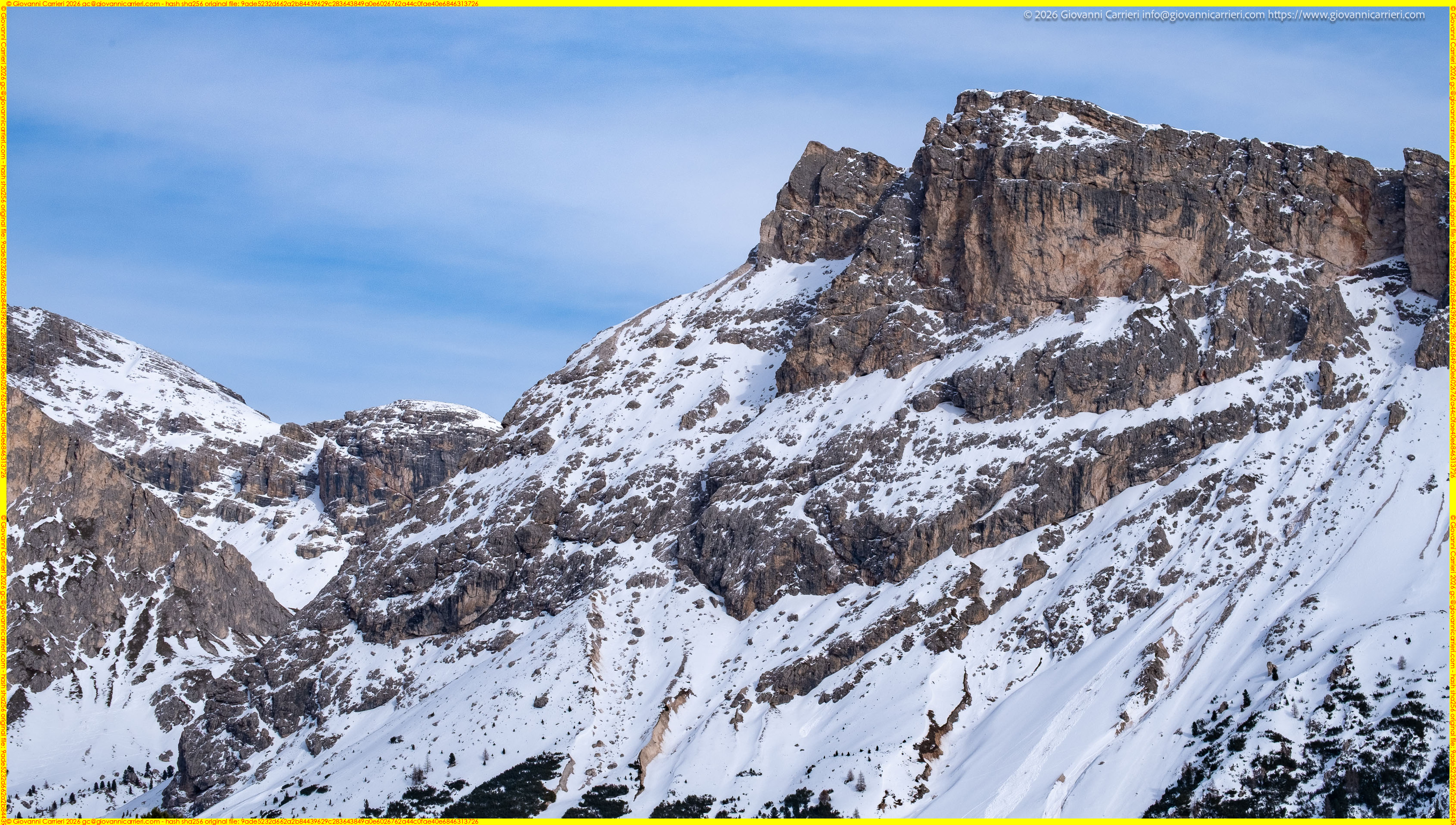 Si attesta che in data 19/01/2026 alle 09:01:57 il/la Sig./Sig.ra Giovanni Carrieri (ragione sociale Giovanni Carrieri) ha registrato l'immagine denominata "Dettaglio dello Spallone del Sassolungo dal Col Raiser in Val Gardena" qui riprodotta. Il titolare dei diritti d'autore ha dichiarato che sia stata pubblicata nel corso dell'anno 2026.